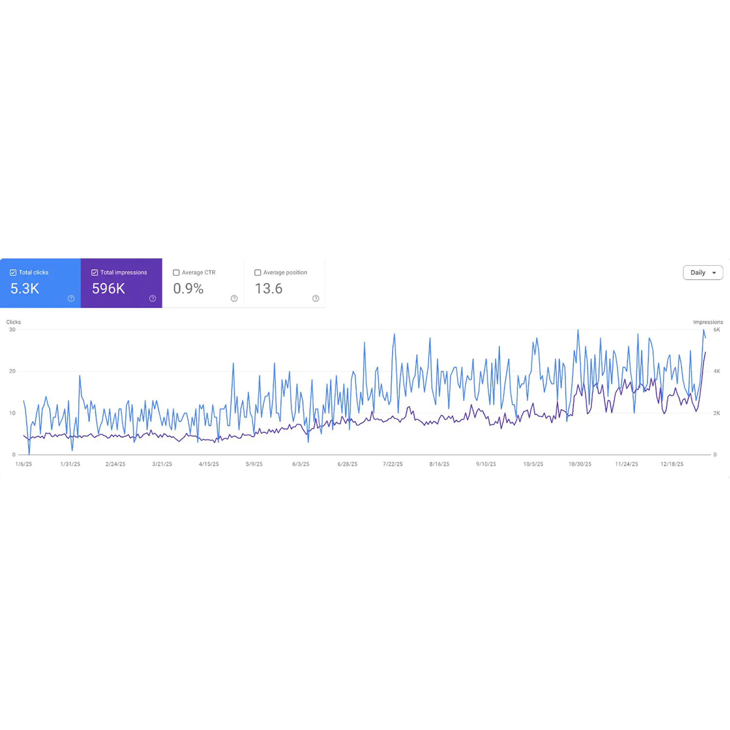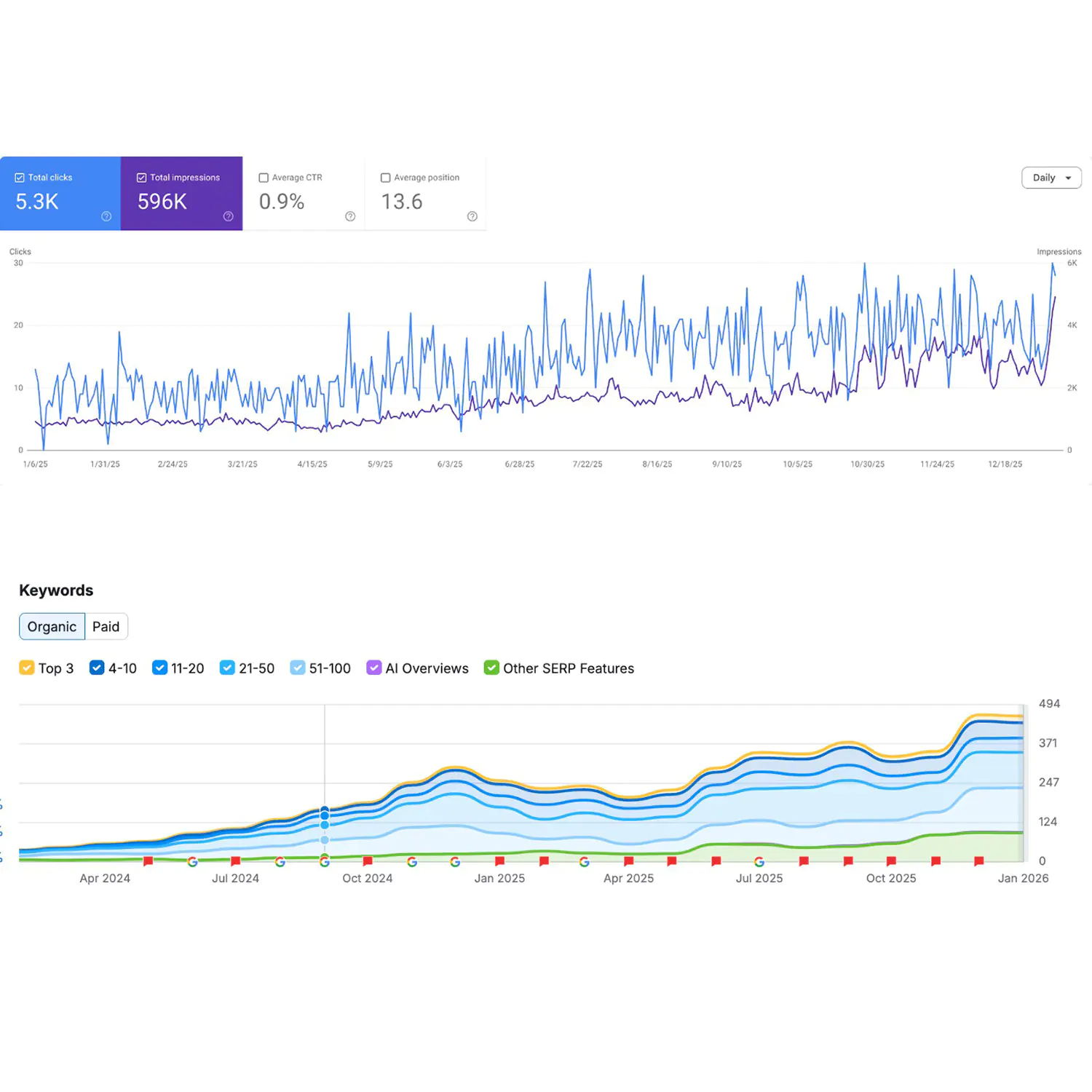- Continuously tracked rankings, impressions, CTR, and engagement