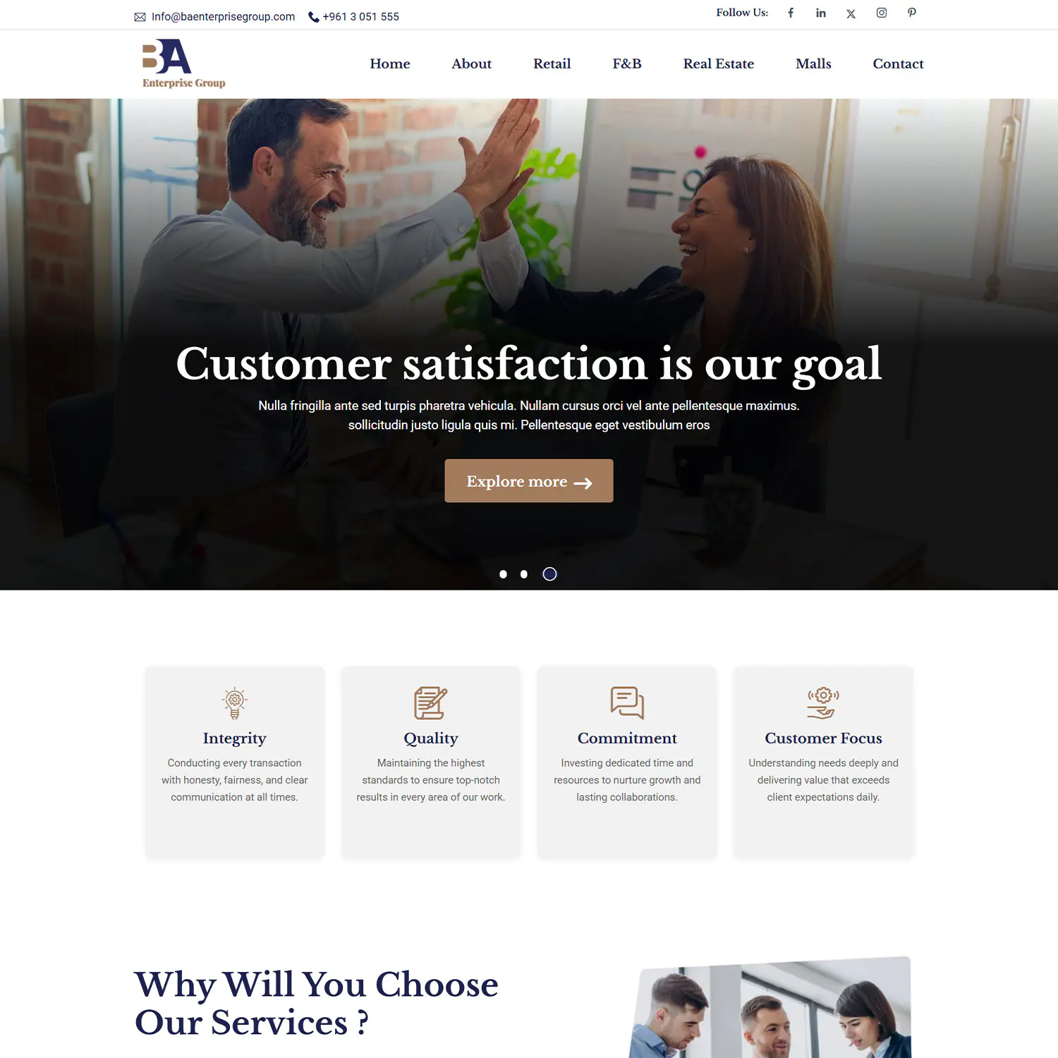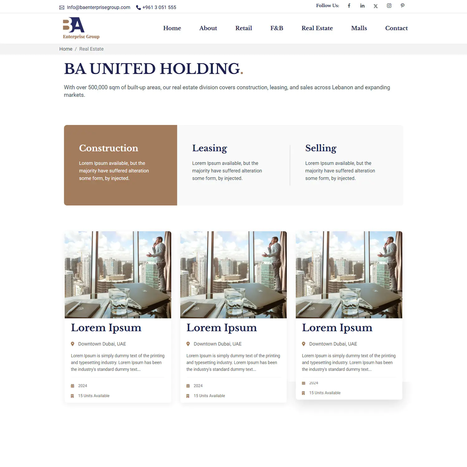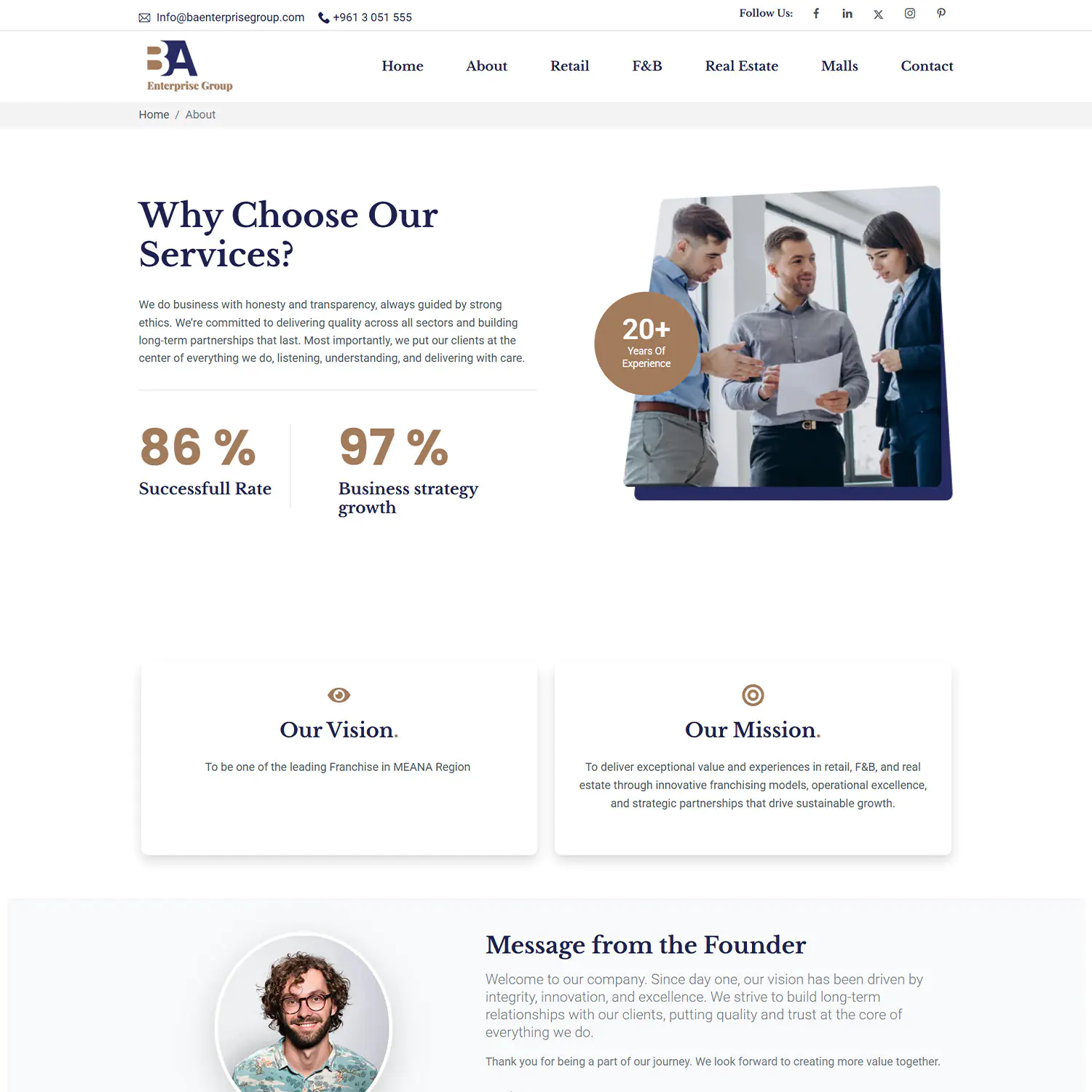 BA Enterprise Group required a professional online presence that clearly communicates its diversified business units: retail, food & beverage, real estate development, and shopping mall projects, while reinforcing trust through experience and client-centric values. The goal was to translate decades of experience into a digital format that strengthens credibility and supports future business inquiries.