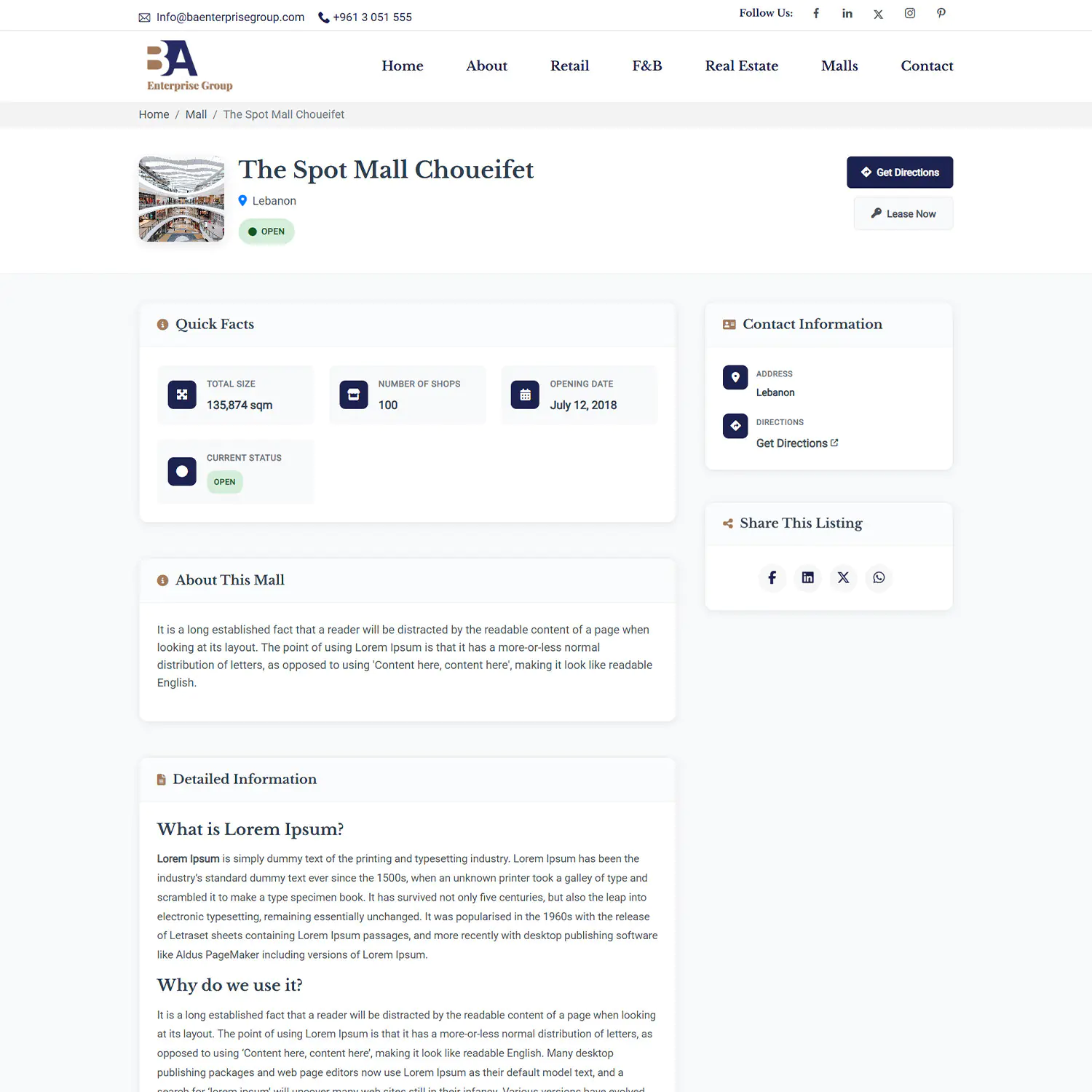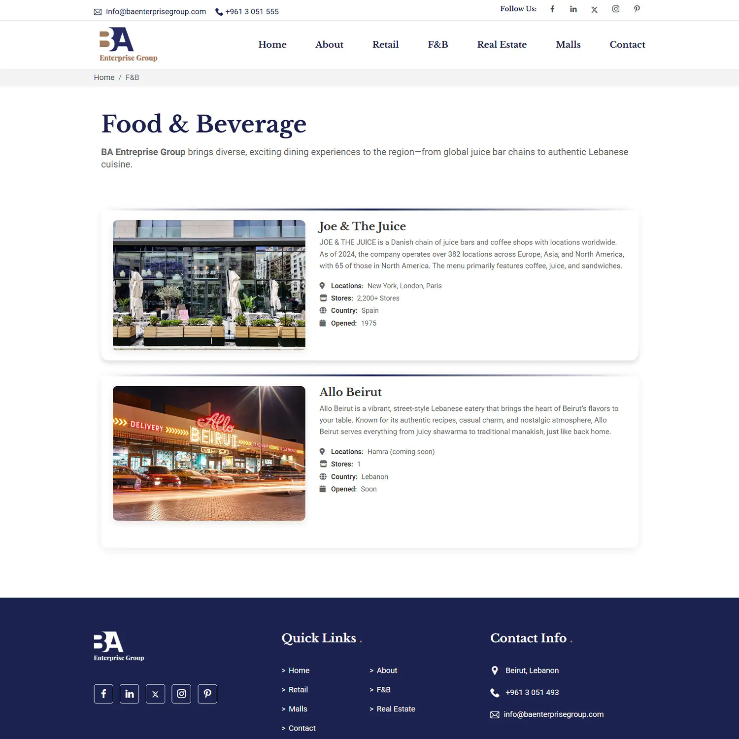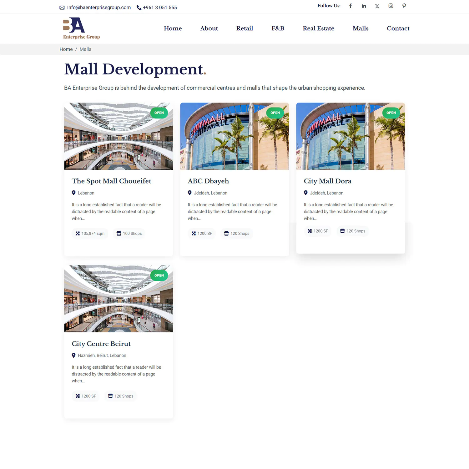 - Structuring content so users can instantly understand service categories (Retail, F&B, Real Estate, Malls)