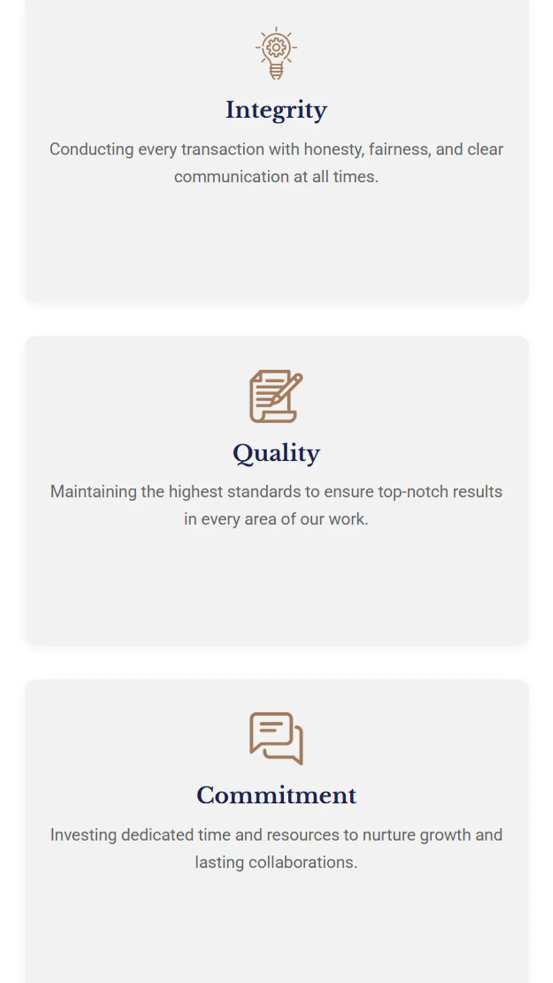 - About & Values Page – Strong brand narrative focusing on ethics, experience, and client-centric service.
