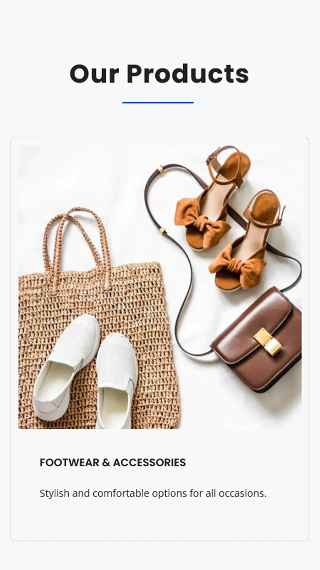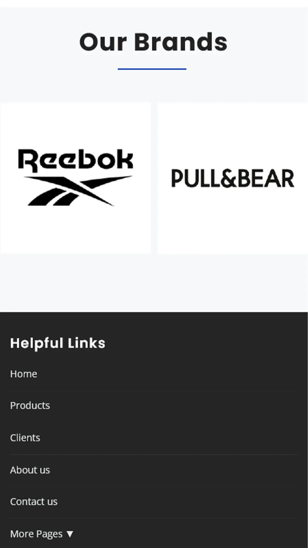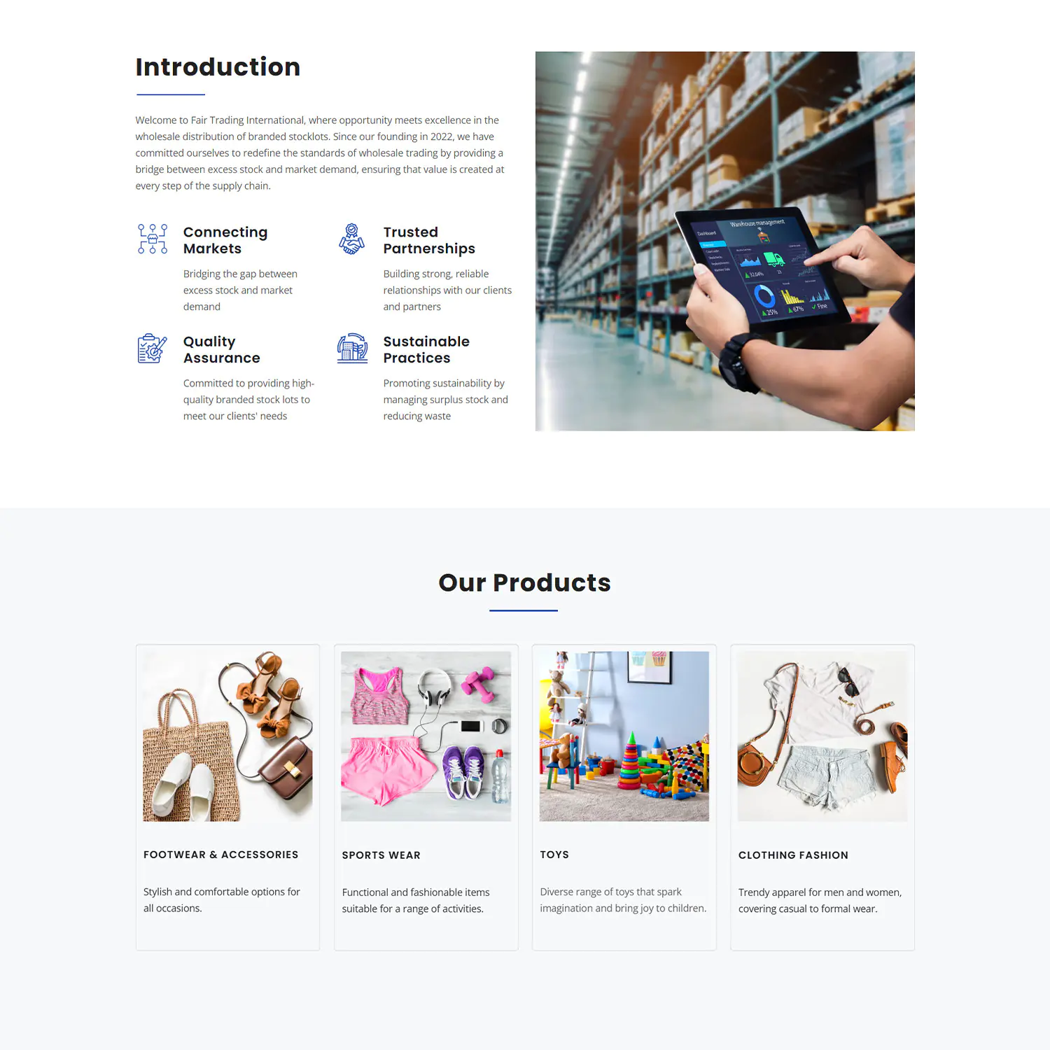 - Products Section: Categorizes branded stocklots (clothing, sportswear, accessories, toys) for seamless browsing.