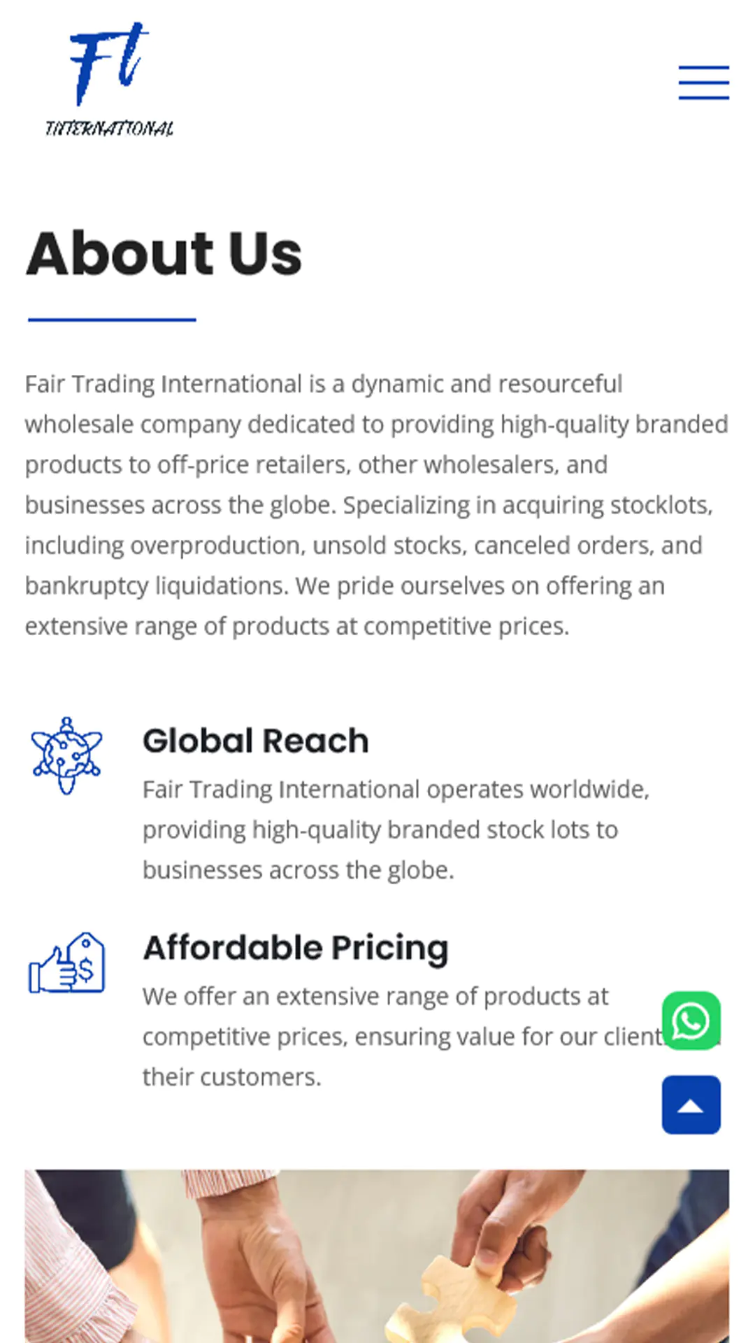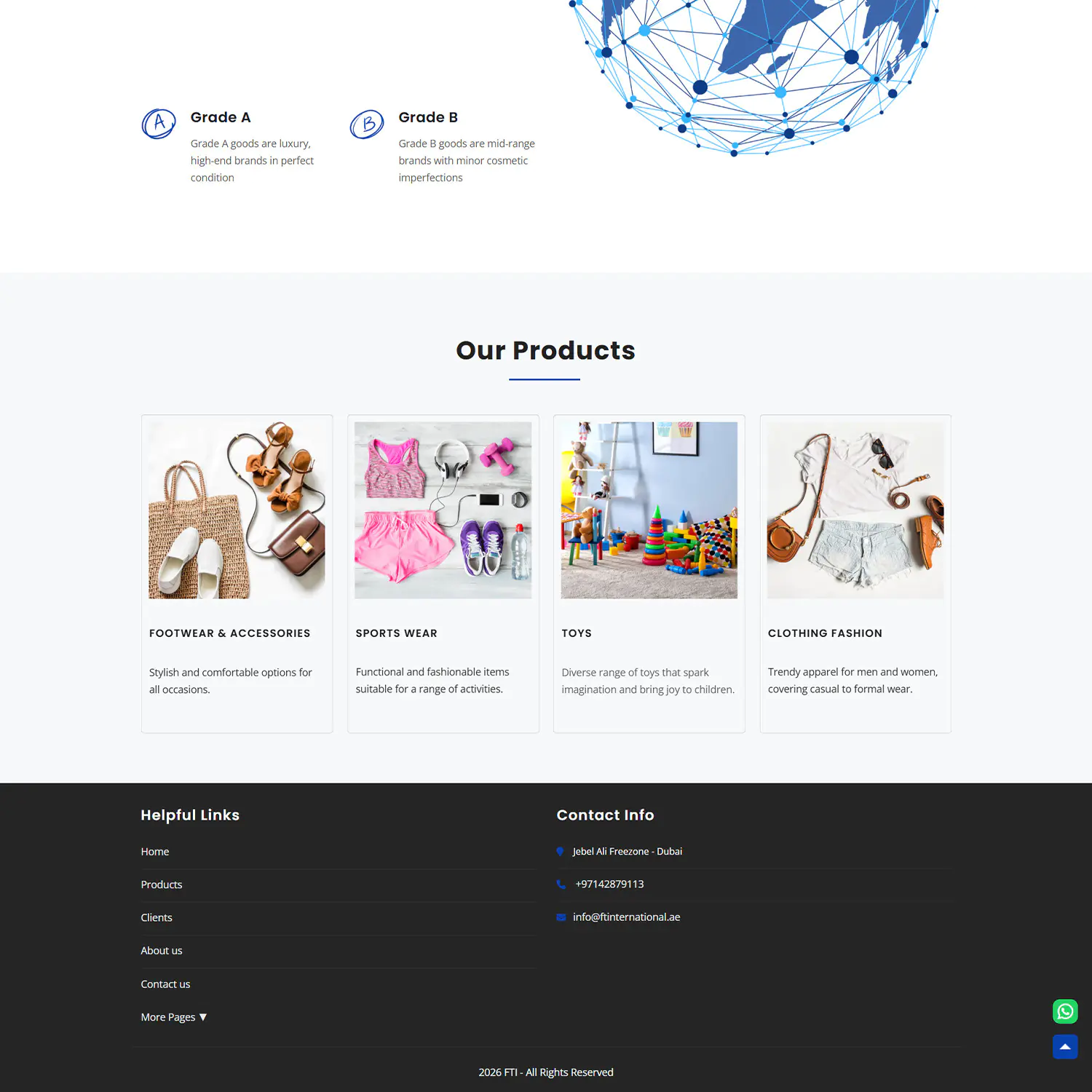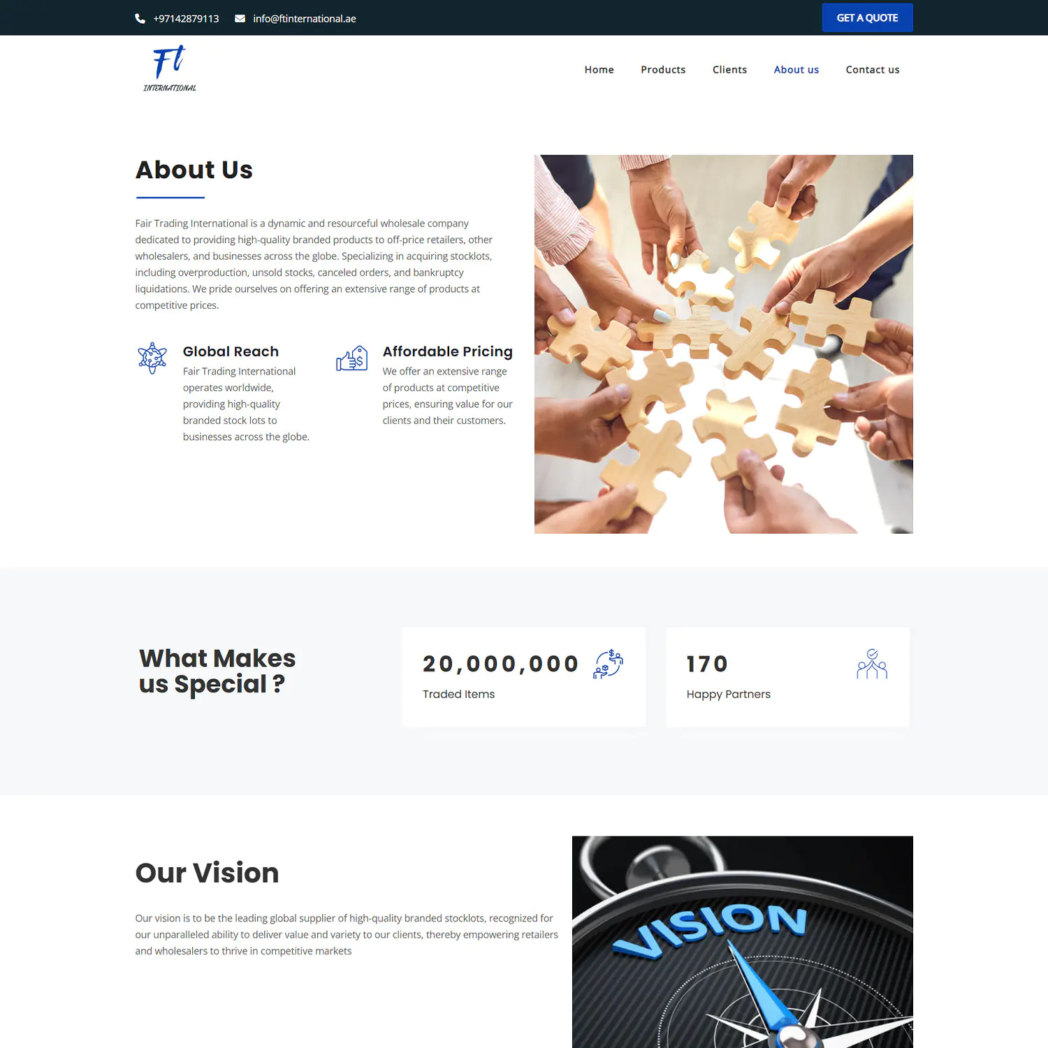 - Homepage with Brand Positioning: Introduces FT International’s mission and strategic role in wholesale distribution clearly.