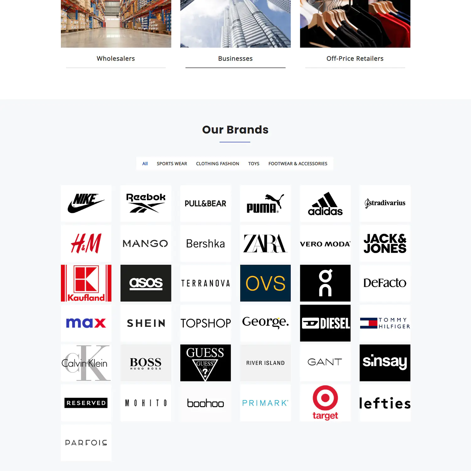 - Organized product segments (clothing, footwear, accessories, toys, etc.) and wholesale solutions into logical sections for easy access.