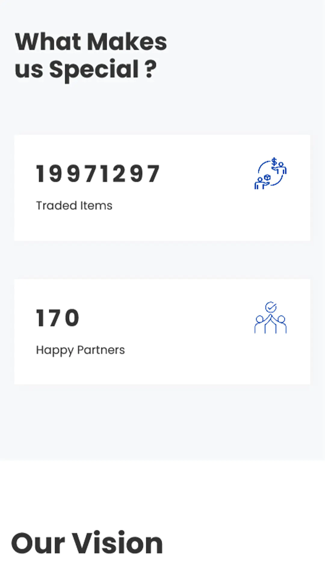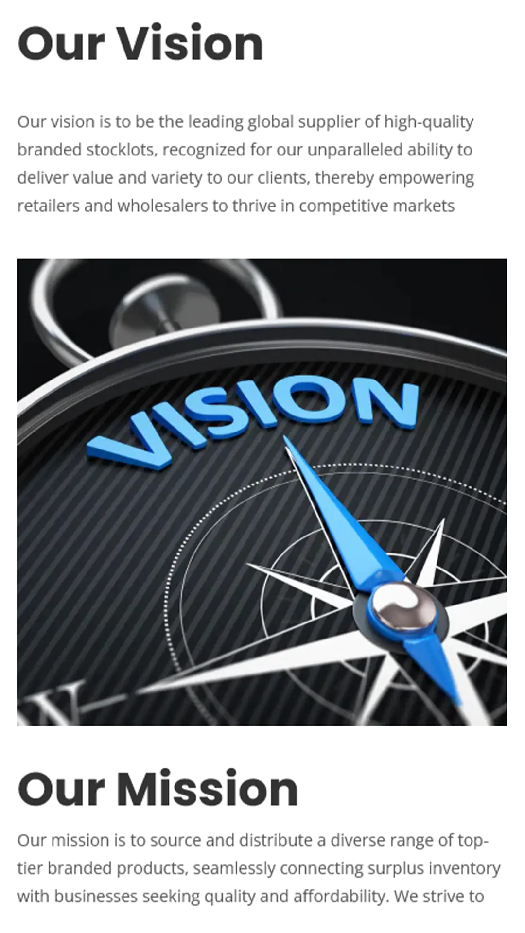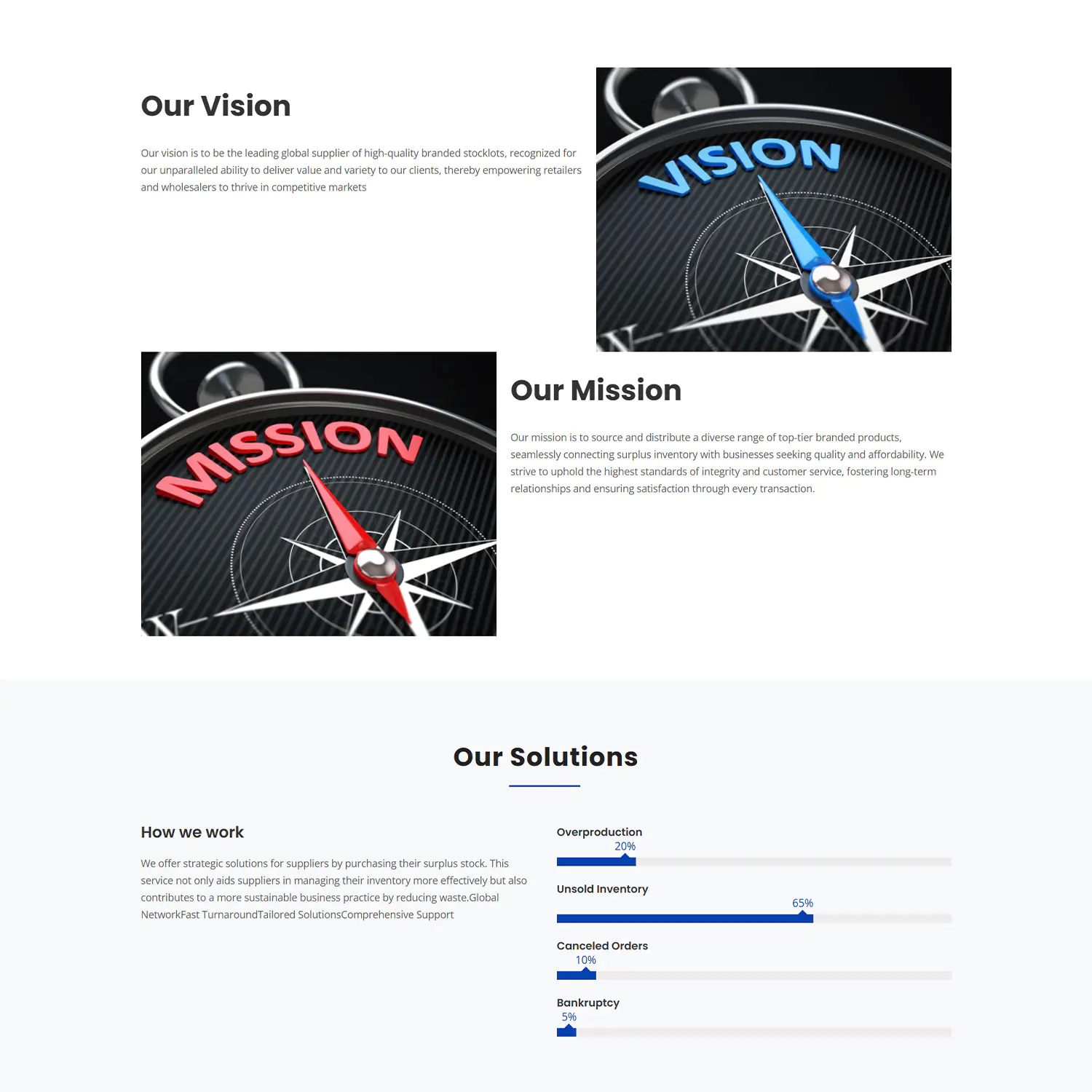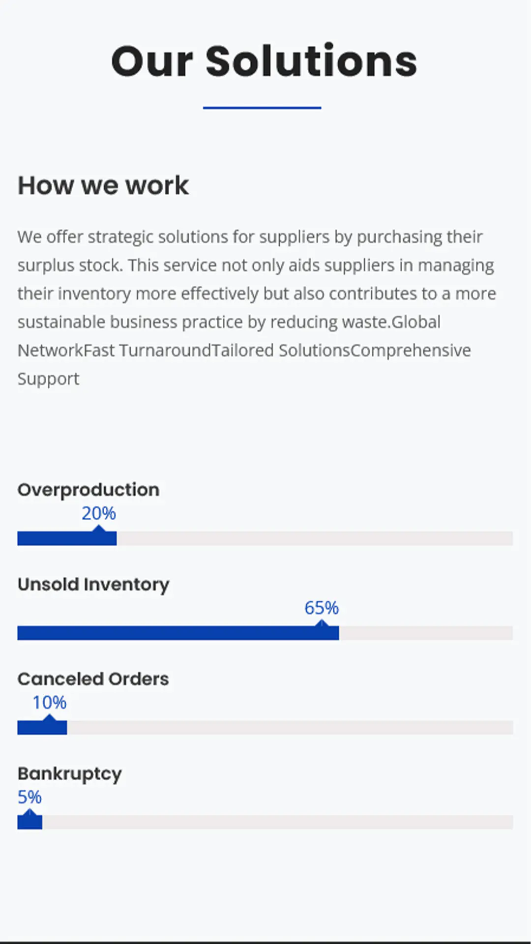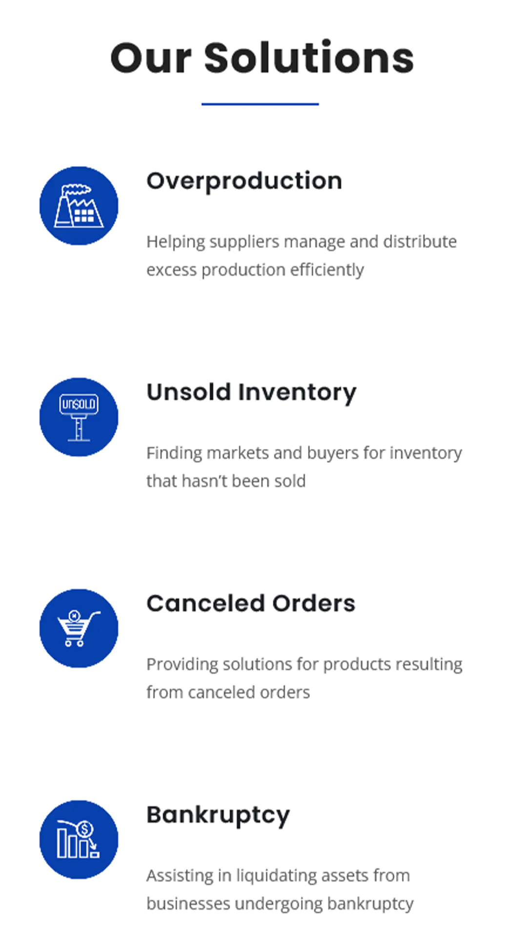 - Solutions Overview: Shows how the company helps suppliers handle overproduction, unsold inventory, canceled orders, and liquidation stock.
