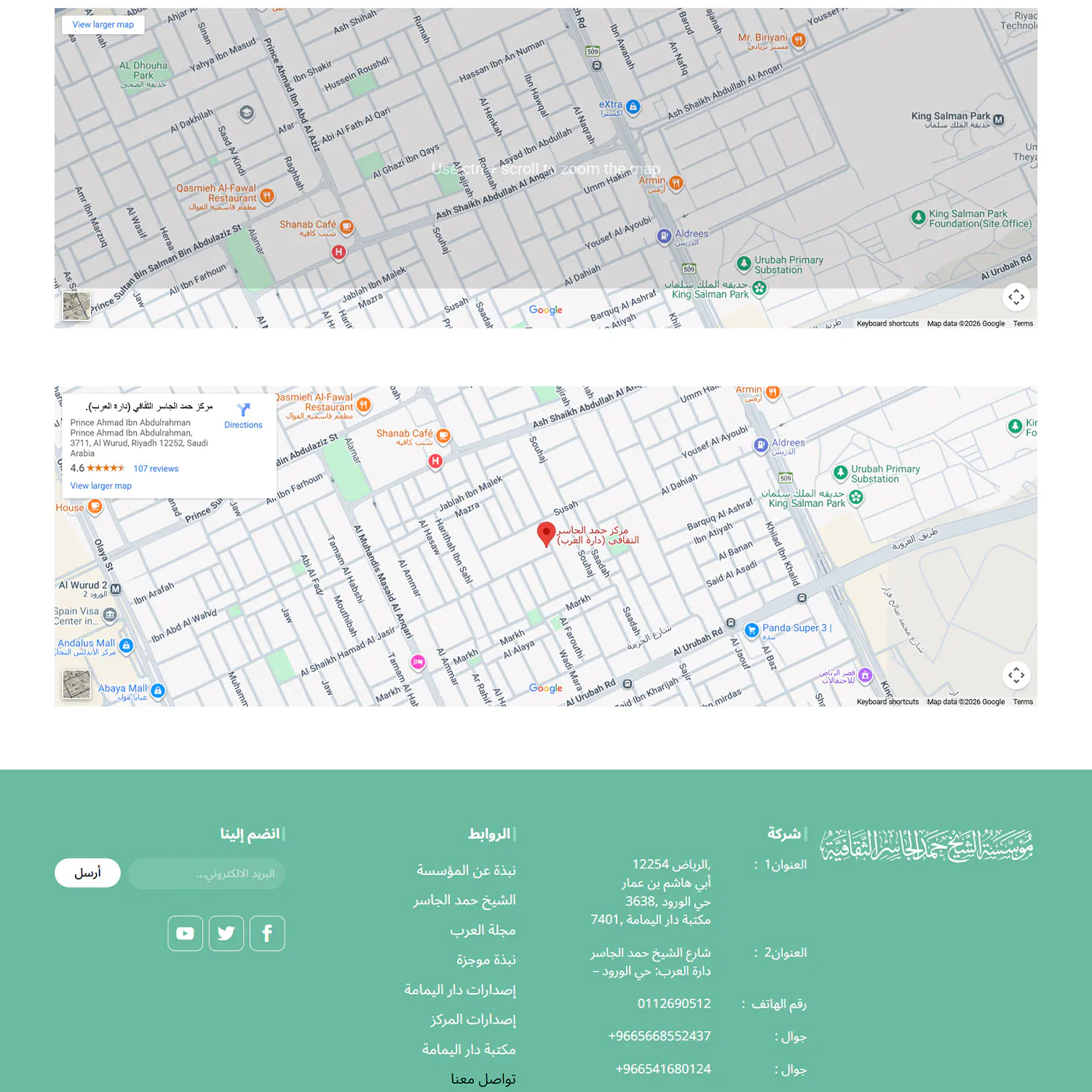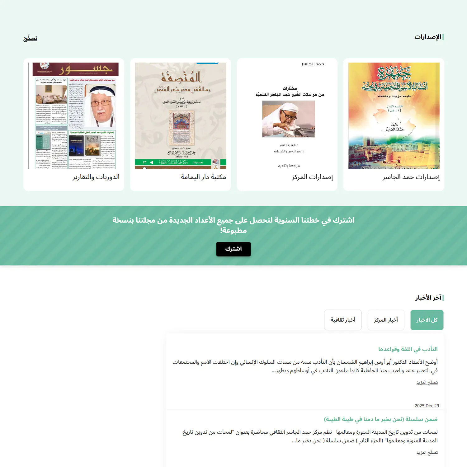 - Cultural Center Overview: Informational sections highlighting the mission, activities, and initiatives of the Hamad Al Jasser Cultural Center.