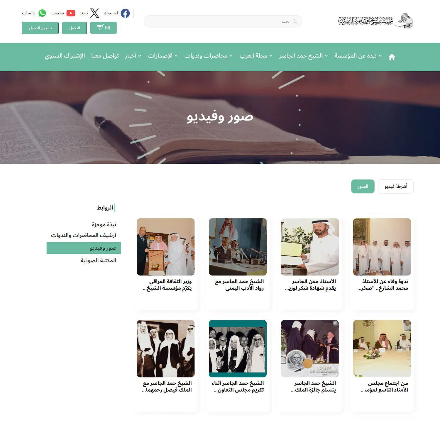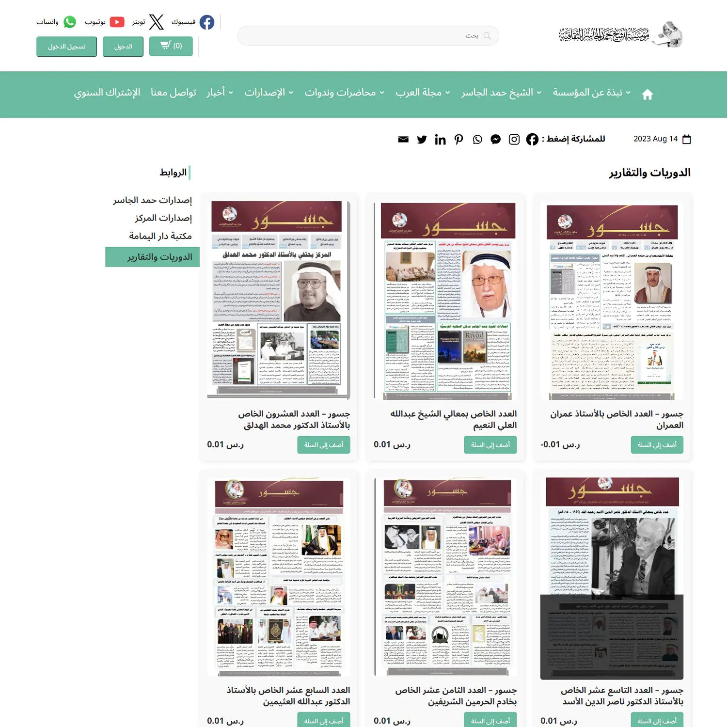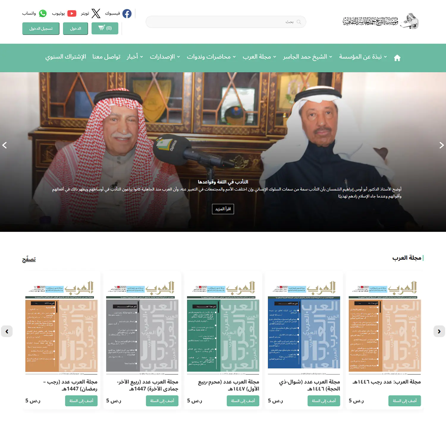 - Publications Library: A digital catalog showcasing magazines and publications associated with the Hamad Al Jasser legacy, including Al-Arab magazine.