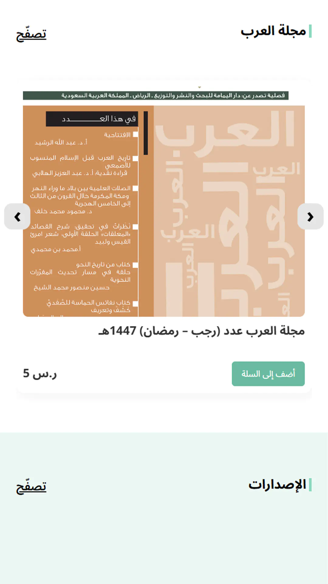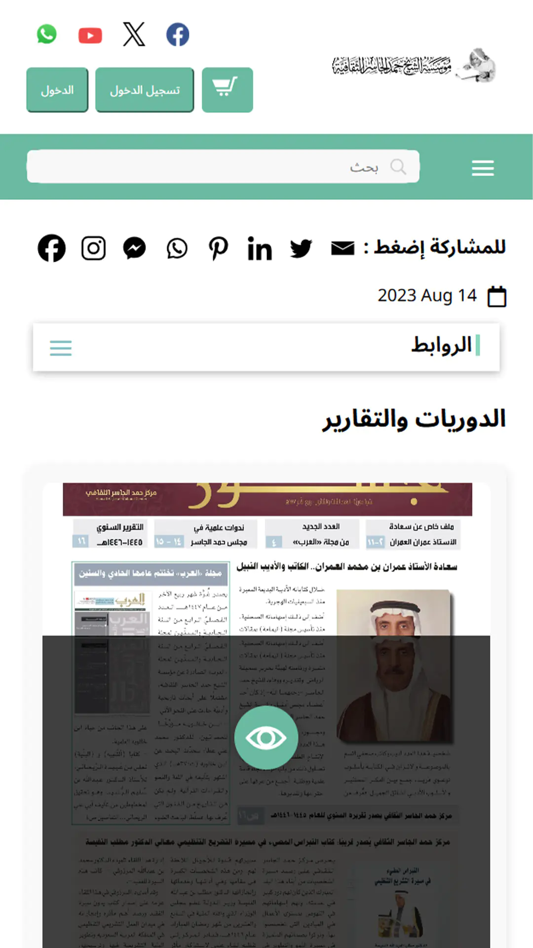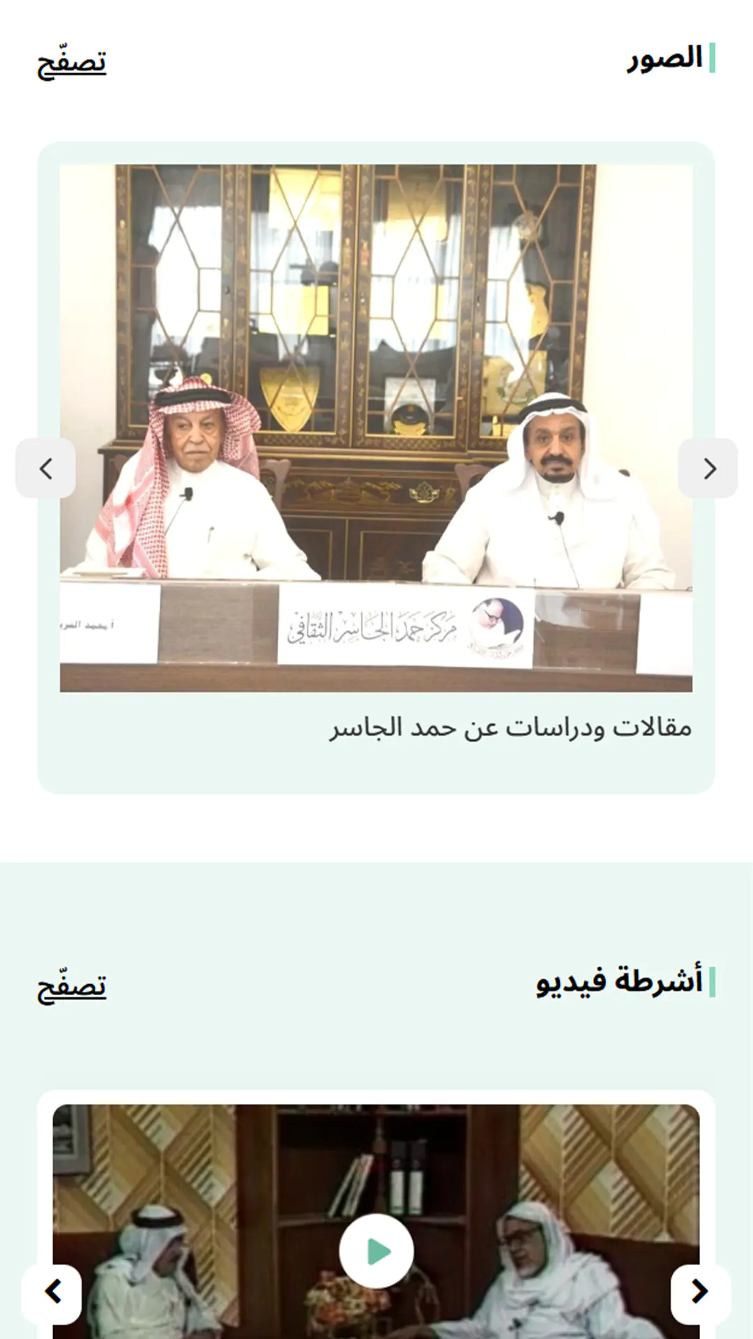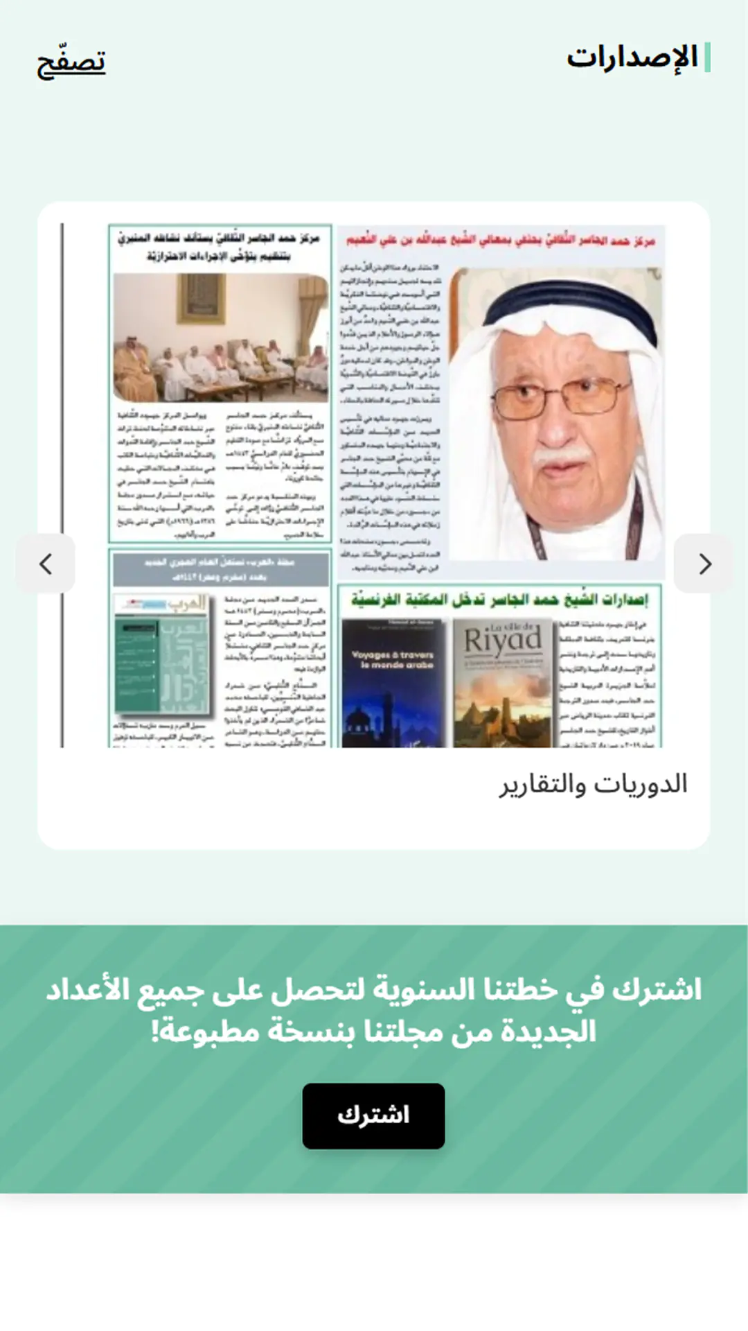 - Publications Library: A digital catalog showcasing magazines and publications associated with the Hamad Al Jasser legacy, including Al-Arab magazine.