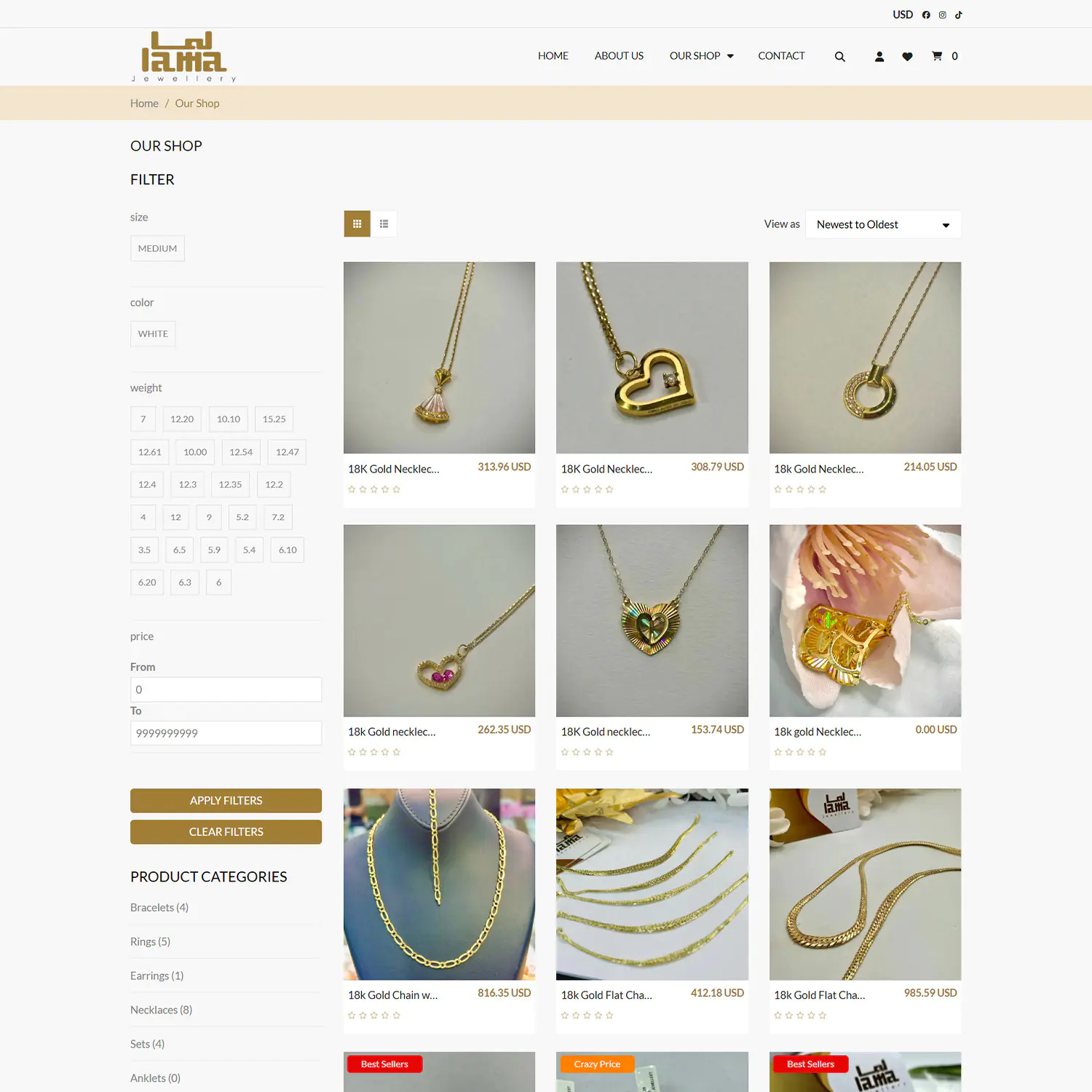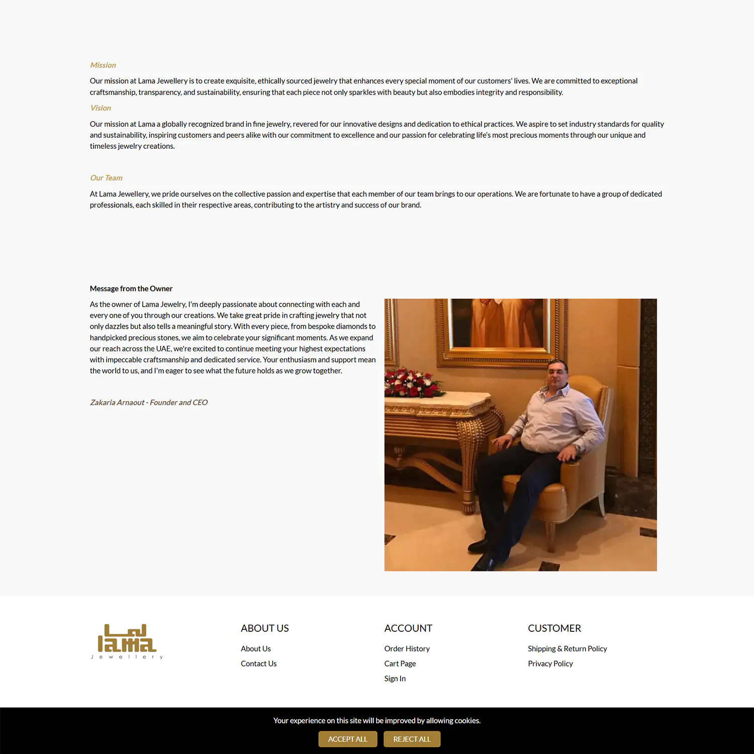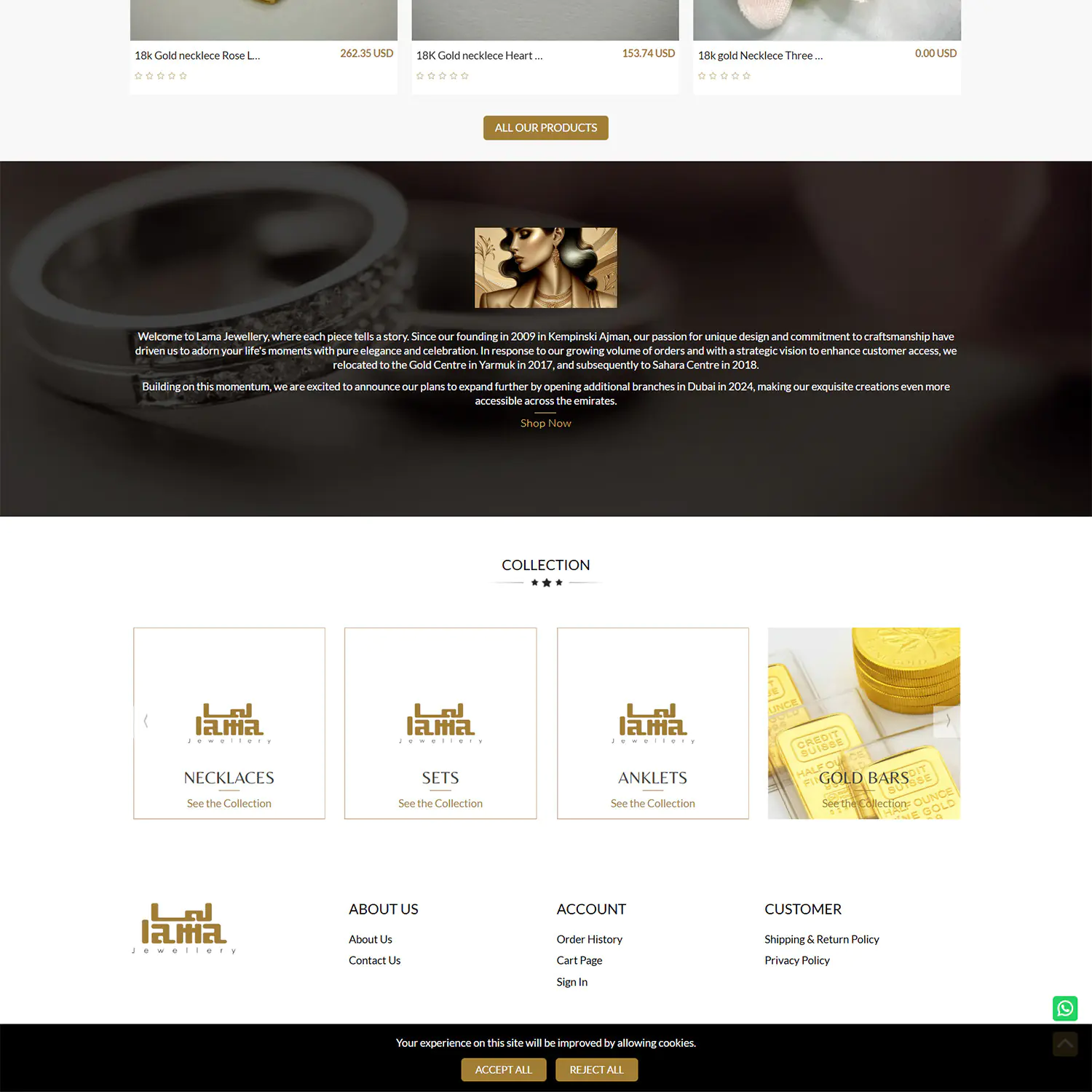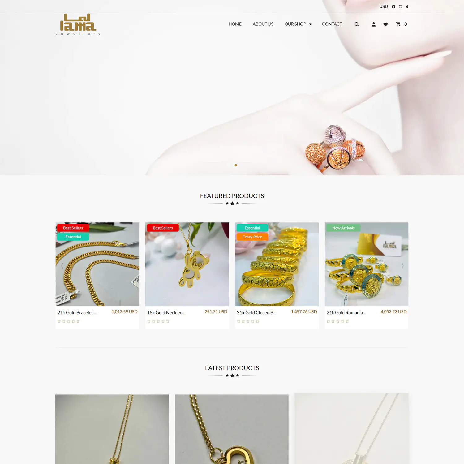 Lama Jewelry is a luxury jewelry brand offering handcrafted gold and precious metal pieces. The brand combines traditional craftsmanship with modern e-commerce, allowing customers to browse, customize, and purchase jewelry online while ensuring pricing accuracy based on real-time precious metal values.